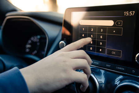 Teen drive a car and use infotainment. Young man reading messages and make phone call while driving. Dangerous behavior, accident risk. Danger, transgression, youth, distraction concept. Focus on hand