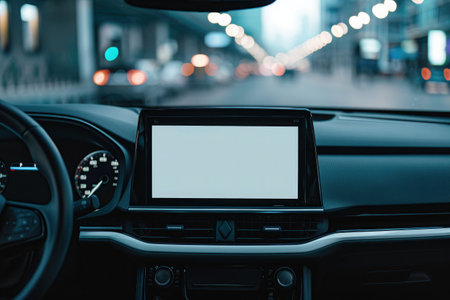 Close-up of a modern vehicle's dashboard featuring a blank infotainment screen, with a blurred street in the background
