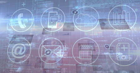 Image of network of connections with icons over data processing. Global connections, computing and digital interface concept digitally generated image.