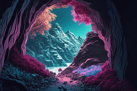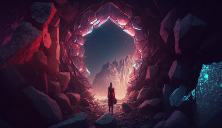 A solitary figure ventures into a stunning cave, surrounded by enchanting hues of pink and blue lighting. The contrasting colors create an atmosphere of mystery and adventure.