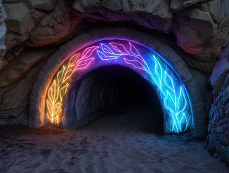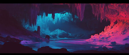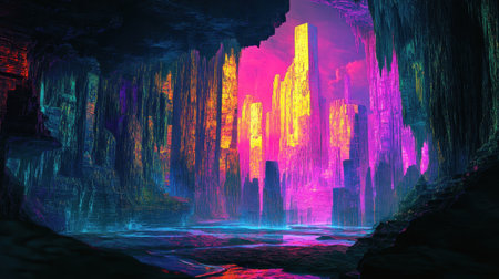 A fantastical underground scene with vibrant neon lights illuminating cave structures.