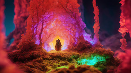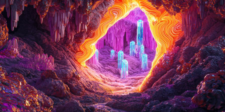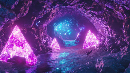 Mesmerizing Glowing Cavern of Otherworldly Crystal Formations in Vibrant Fantasy Landscape A captivating and surreal scene with colorful