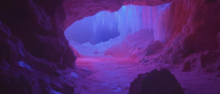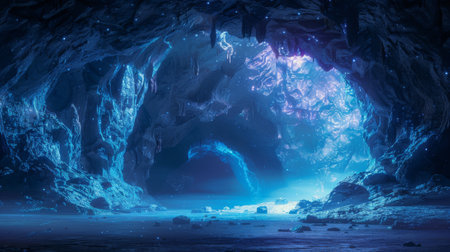 Glowing ice cave illuminated with magical blue and purple light in an otherworldly setting