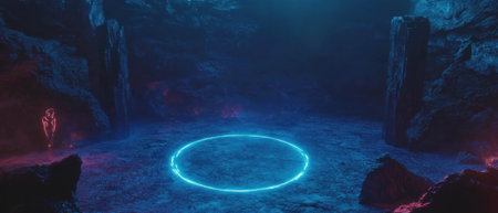 Mystical glowing magic circle in an enchanted cave setting with protective barrier effects