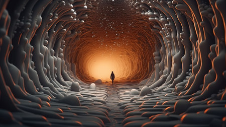 Mystical Cave Opening to a Galactic Sky. A lone figure stands before an expansive universe, framed by the jagged edges of a dark cave. Fantasy illustration. Ideal for sci-fi and fantasy themes.