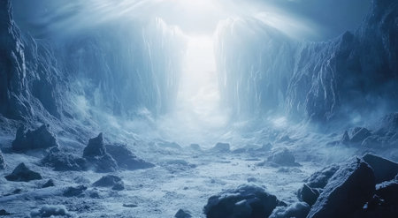 A cinematic, fantasy landscape: a mountain range in the center of the frame with an opening that leads to another world filled with mist and light rays shining through. The scene is covered in snow and ice, and the foreground features rocks and debris frozen into the ground. This was shot on an ARRI Alexa cinema camera, in the style of a fantasy landscape painting. --ar 78:43 --v 6.1 Job ID: 7126db36-163c-4769-a9ec-c01fd02be8ec