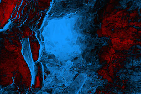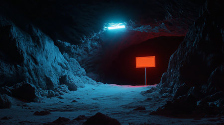 An illuminated cave with contrasting blue and red lights guiding the path to unknown depths during nighttime exploration