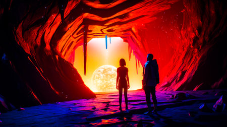 Two people standing in a cave looking at a giant object in the distance. Generative AI.