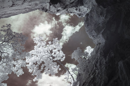 a view from inside a rocky crevice or cave, looking up towards the sky