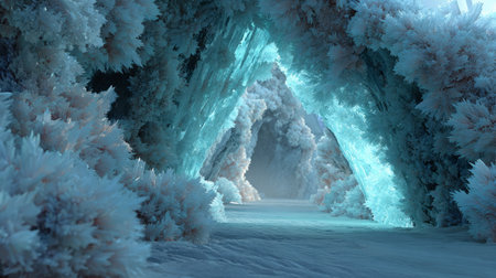 magical icy cave entrance glows with blue light, surrounded by frosted trees and snow-covered branches in a winter wonderland