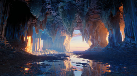 Icicles hang dramatically from the cave ceiling glowing in shades of purple and blue during twilight hours showcasing natures artistry.