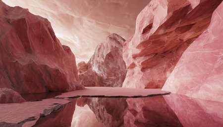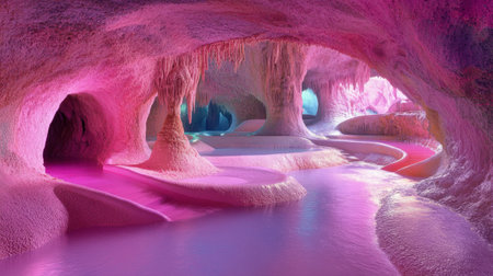 A mesmerizing cave scene filled with vibrant pink and purple lighting reflecting on calm water. This enchanting landscape showcases unique geological formations in a serene and mystical setting.