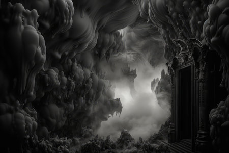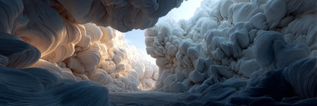 Mysterious Frozen Cave Entrance Winter Landscape Dramatic Blue Ice icy fog cold snow dark mist path