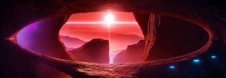 futuristic image of a cave with a cross-shaped opening. The opening emits a red light that illuminates the purple and pink hues of the cave walls.