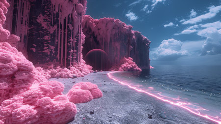 The metallic portal in the middle of the clear river that connected to the ocean that has surrounded with the bright blue cloudy sky and the pink desert with the pink tree and pink mountain. AIGX03.