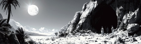 A black and white photo of a desert landscape with a large cave in the foreground. The cave is partially obscured by a rocky outcrop and features three figures standing at its entrance. A palm tree is visible in the foreground to the left, with another palm tree further back in the distance. The sky is a bright white and features a large, illuminated moon in the upper left corner.