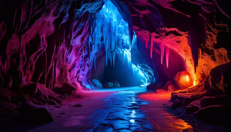 Neon-lit cave with colorful lights illuminating icy formations and reflections