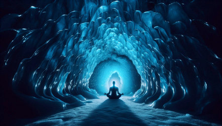 Glowing blue ice cave interior with lone figure in seated meditation, Ai generated image