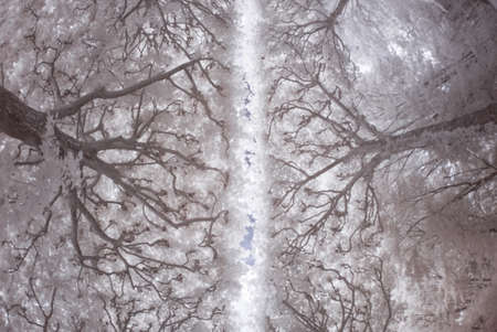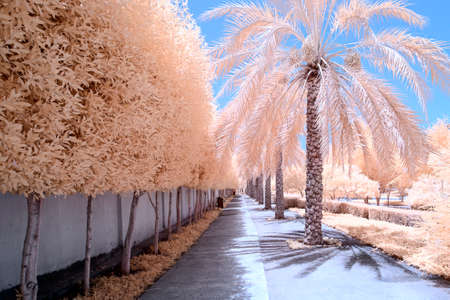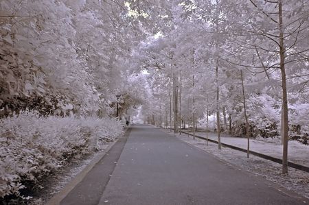 Infrared photography, a pathway lined with tall trees, likely in a forested area