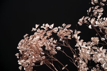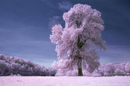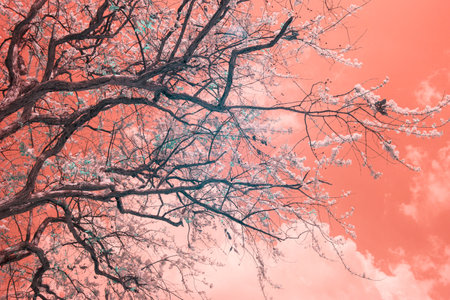 An infrared style, a tree with a complex network of branches, some adorned with blossoms