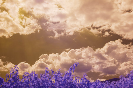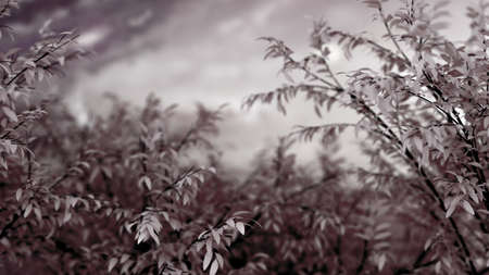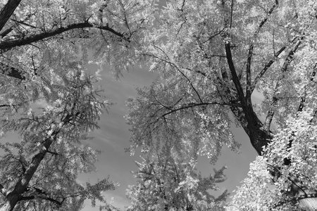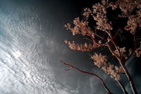 Infrared photography, a vast sky filled with fluffy clouds with leaves