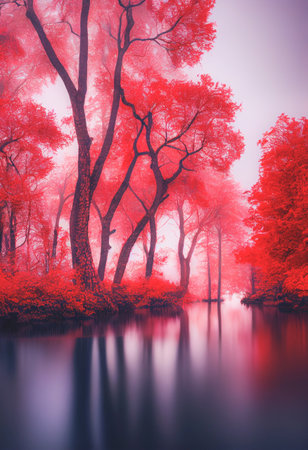 Fantasy landscape with red trees and foggy sky. 3d rendering