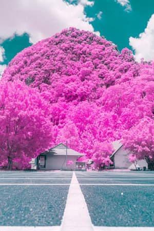 Infrared effect, a landscape featuring a large, vibrant pink hill surrounded by similar pink trees. In the foreground, there is a parking lot with marked spaces