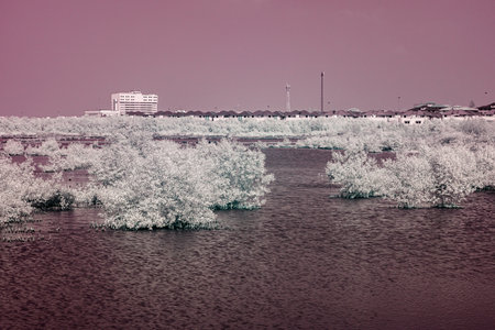 Infrared photography, a landscape featuring water and vegetation in a wetland or coastal area