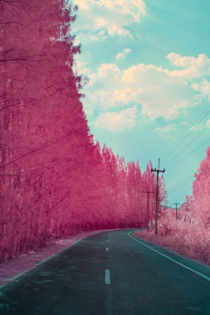 Infrared photography, a winding road surrounded by trees. The trees have a vibrant pink color, creating a surreal effect