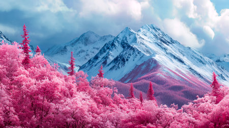 Infrared effect, a mountainside covered in vibrant pink foliage, with clouds in a blue sky above