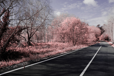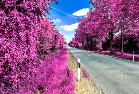Stunning infrared view on purple fantasy landscapes with some ashpalt roads