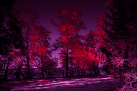 Infrared techniques, trees with bright red leaves set against a vivid blue sky