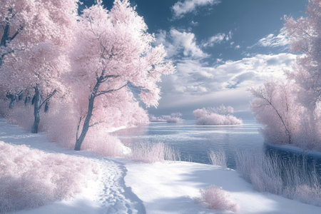 Soft pink trees line a tranquil lake under a cloudy sky, creating a peaceful winter atmosphere.