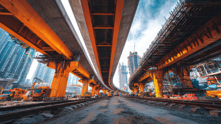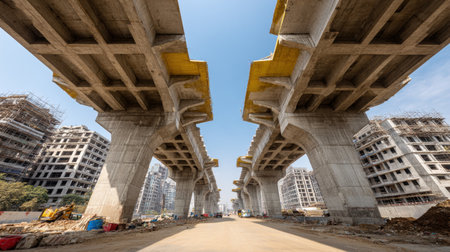 A striking view of an urban construction site showcasing elevated concrete beams, bustling building activity, and the essence of modern architecture under a clear sky.