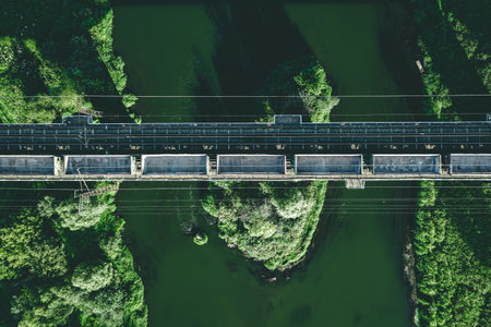 A captivating aerial view showcasing a water reservoir with a dark concrete wall, contrasting against the serene blue of the water surface, highlighting natural beauty.