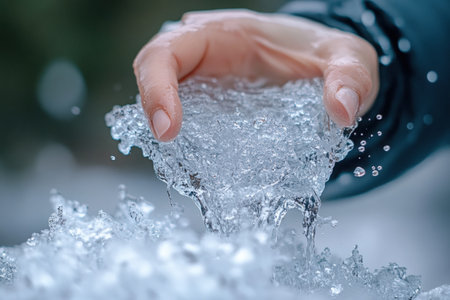 Hand interacts with clear water, creating ripples, surrounded by soft white snow, illustrating the serene beauty of nature and human connection with the environment