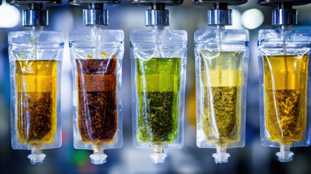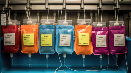 Bright clinical setting with IV drip bag containing therapy solution and fruit. Concept Clinical Setting, IV Drip Bag, Therapy Solution, Fruit, Bright Colors
