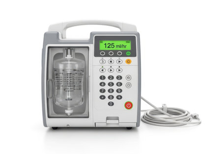 A detailed close-up of an advanced infusion pump, essential for accurate and controlled administration of intravenous fluids and medications in hospitals and clinics.