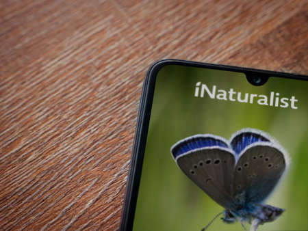 Lod, Israel - July 8, 2020: iNaturalist app launch screen with logo on the display of a black mobile smartphone on wooden background. Top view flat lay with copy space.