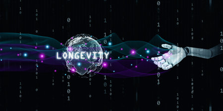 Artificial intelligence robot hand holding global longevity concept with binary numbers, neon wave, and digital earth, representing advanced technology, future science, and global progress.
