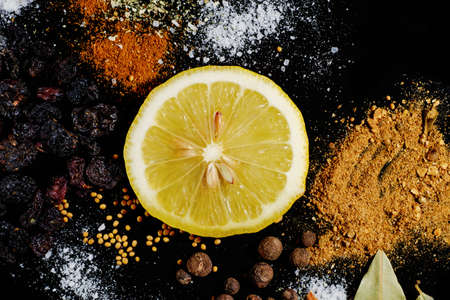 Cooking ingredients background. Spices, vegetables, garlic, yellow peppers chili. Black background, preparation food concept, flat lay, hard light, dark shadow, banner format