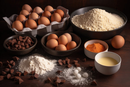deconstructed chocolate cake, with ingredients including flour, sugar and eggs visible, created with generative ai