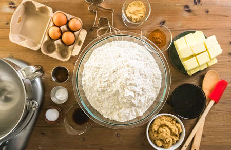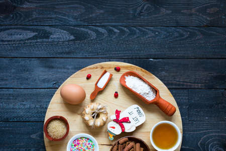 Cooking Christmas cookies. Top view of ingredients for baking homemade cookie