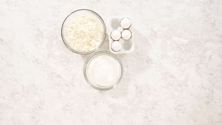 Food ingredients and kitchen utensils for cooking oat cookies on white wooden background. Top flat view. Concept
