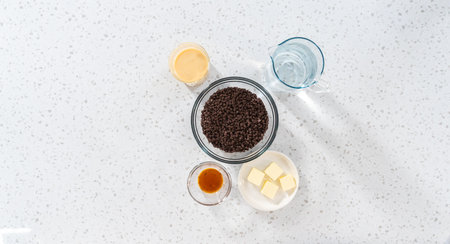 Flat lay. Measured ingredients in glass mixing bowls to make plain fudge.