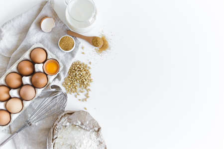 Ingredients for homemade baking. Eggs, milk, flour, sugar. White background, top view, space for text