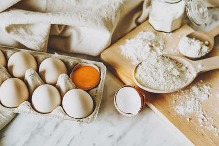 Baking utensils and baking ingredients with eggs, wheat flour, egg yolks