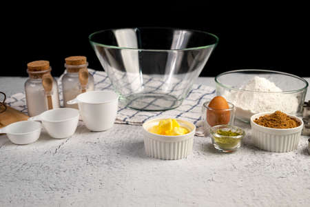 Ingredients for baking Christmas gingerbread cookies top view on white wooden background. Food bakery background.