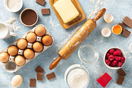 Ingredients for cooking raspberries chocolate pie top view. Bakery background