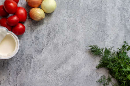 Ingredient for sour cream sauce with garlic, dill and spices on rustic background with copy space